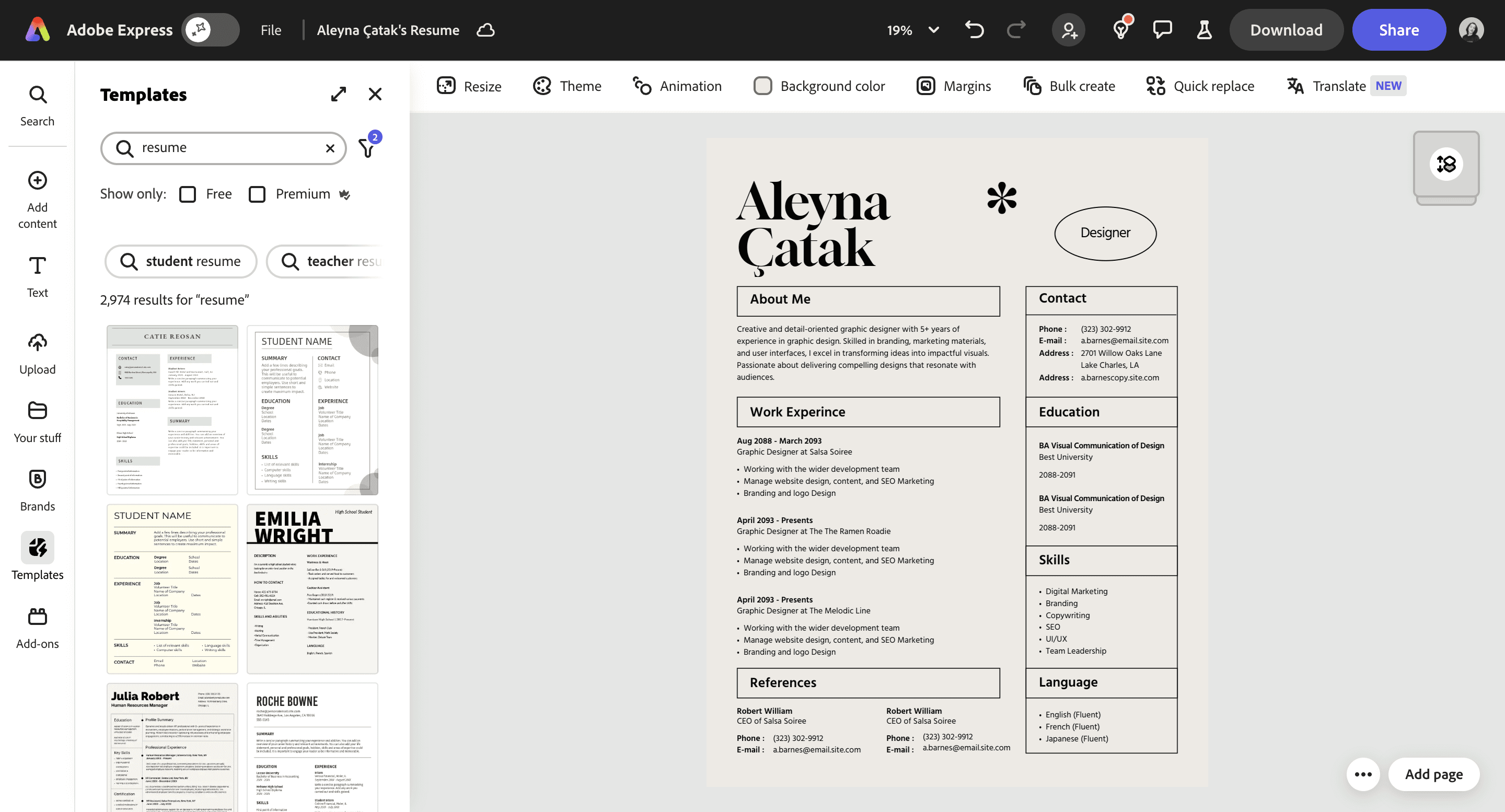 Adobe Express includes customizable templates, simple editing tools, and graphic features that make it easy to create a visual CV that matches your style, even if you don't design.
